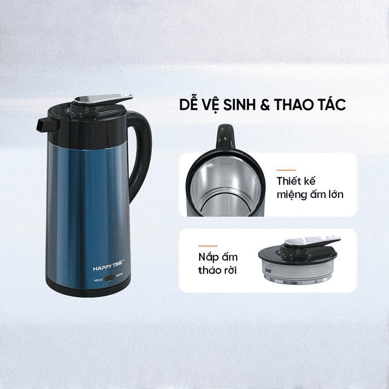 Ấm siêu tốc Happytime HTD1096 dung tích 2L là thiết bị gia dụng tiện lợi giúp đun nước nhanh chóng và giữ ấm hiệu quả. Thiết kế 2 lớp inox bền bỉ, an toàn, phù hợp cho nhu cầu sử dụng nước nóng hằng ngày của gia đình.