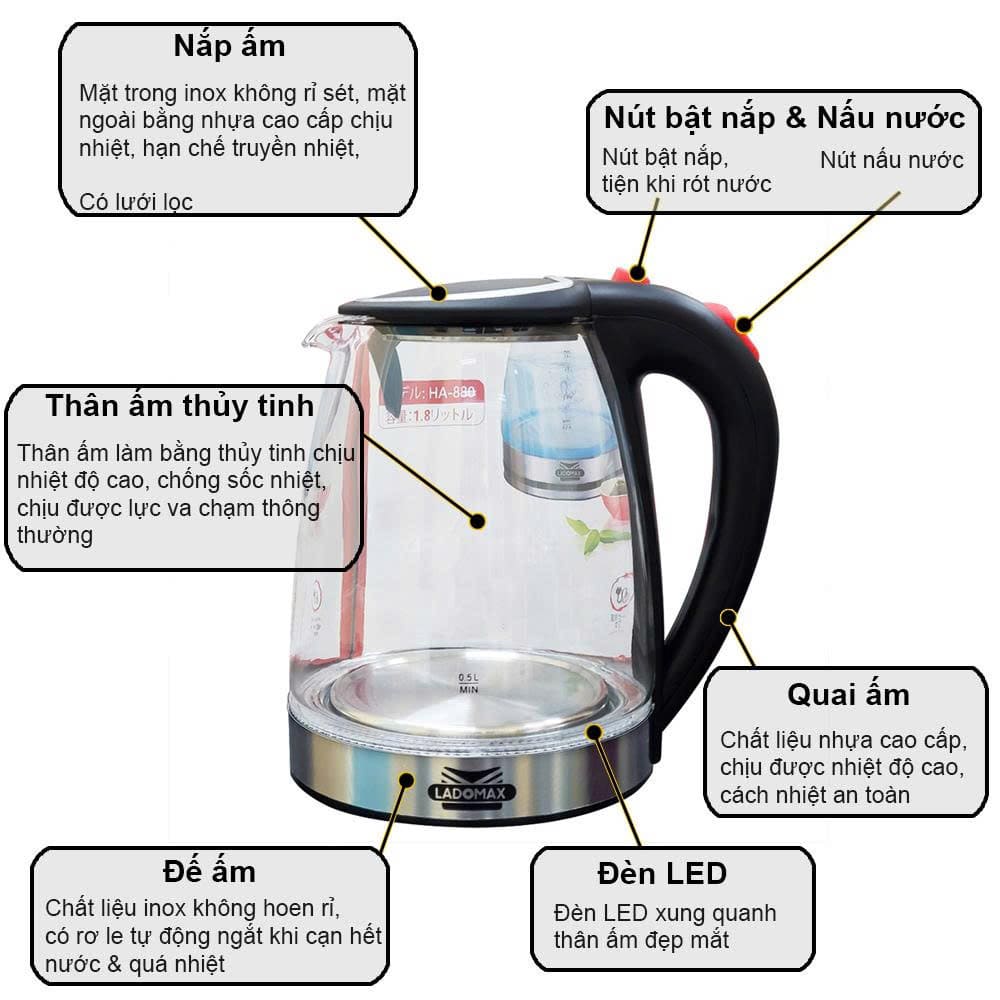 Tên sản phẩm: Ấm siêu tốc thủy tinh Ladomax 1.8 Lít HA-880 cao cấp
