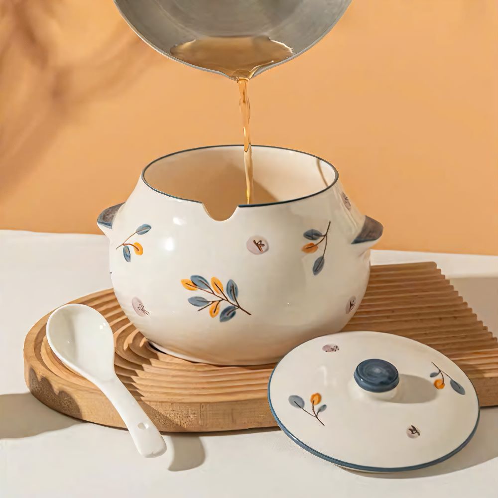 Sử dụng thìa đi kèm: Nên sử dụng thìa gốm đi kèm để múc mỡ hoặc gia vị, tránh dùng vật dụng kim loại có thể làm xước bề mặt sứ.