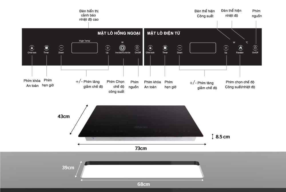 Tương thích: Vùng từ dùng nồi có đáy nhiễm từ, vùng hồng ngoại dùng được tất cả loại nồi