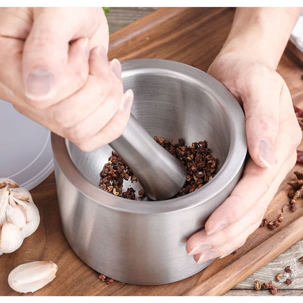 Bộ chày cối inox 304 nguyên khối là dụng cụ nhà bếp tiện lợi giúp giã tỏi, ớt, tiêu nhanh chóng và sạch sẽ. Thiết kế kèm nắp đậy giúp hạn chế bắn nguyên liệu khi sử dụng, phù hợp cho gian bếp gia đình hiện đại.