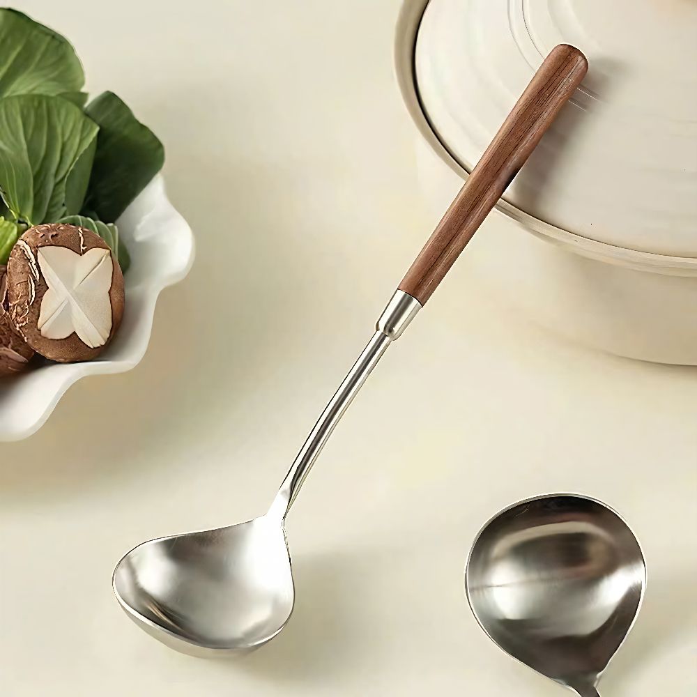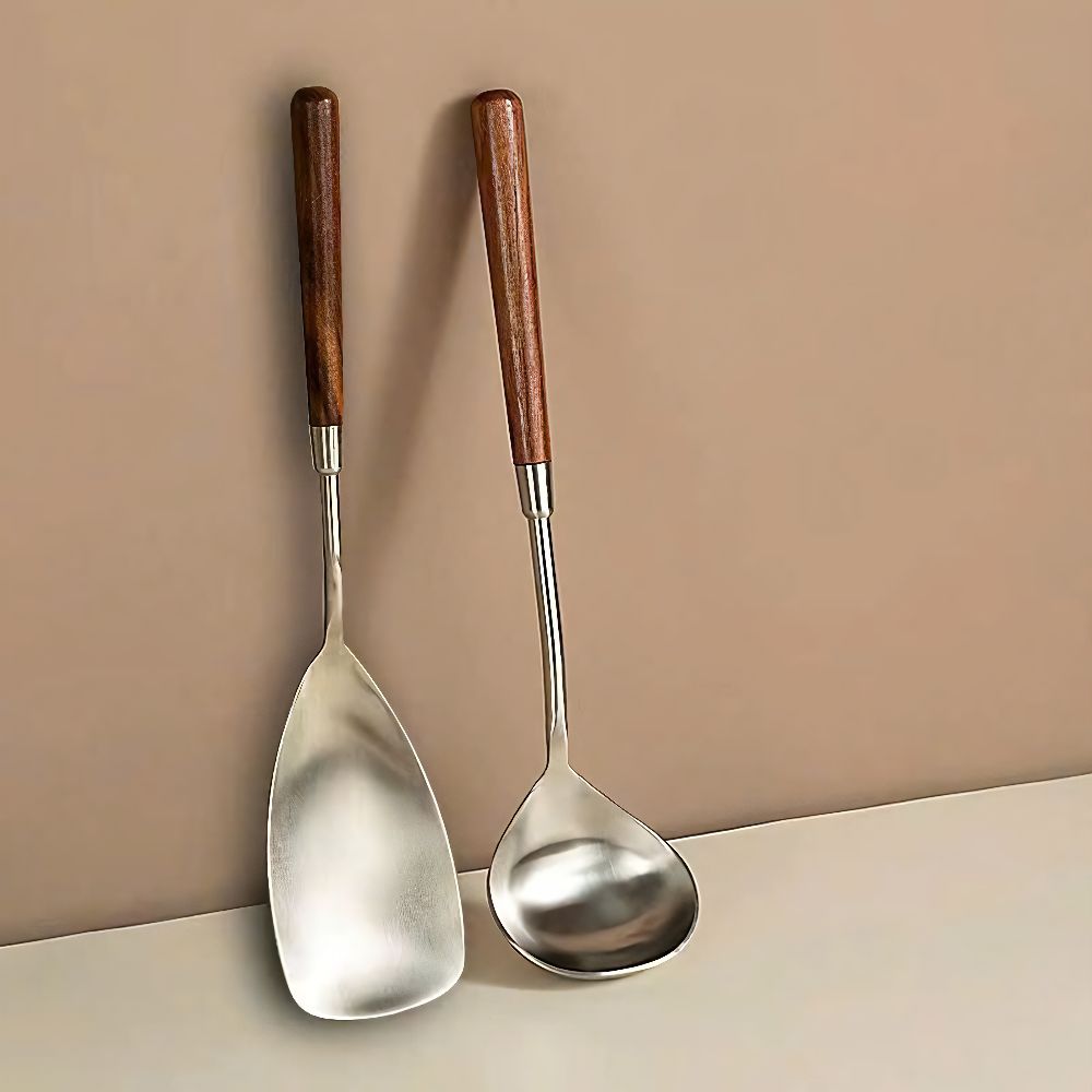Bộ vá múc và xẻng chiên xào sở hữu thiết kế hiện đại với sự kết hợp giữa inox sáng bóng và cán gỗ tự nhiên. Không chỉ giúp công việc nấu nướng thuận tiện hơn mà còn tạo điểm nhấn tinh tế cho căn bếp của bạn.