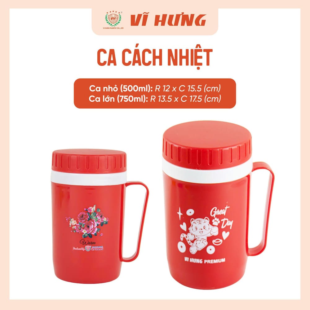 Ca cách nhiệt Vĩ Hưng 500ml 3719 là sản phẩm tiện dụng giúp giữ nhiệt đồ uống tốt hơn so với ca thông thường. Thiết kế có quai cầm chắc chắn, gọn nhẹ, phù hợp sử dụng hằng ngày trong gia đình, văn phòng hoặc quán ăn.