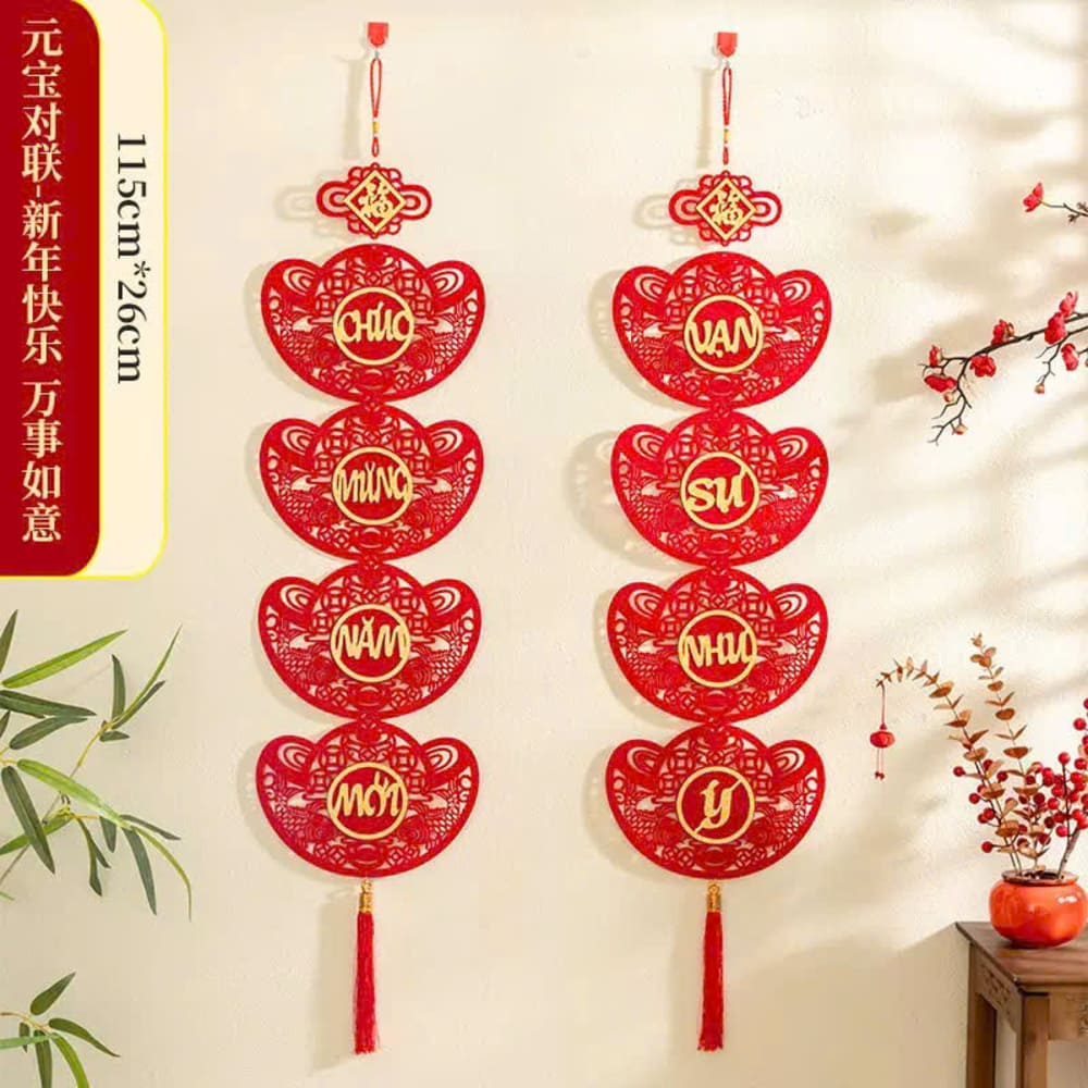 Cặp liễn câu đối hình thỏi vàng là vật phẩm trang trí Tết mang ý nghĩa tài lộc – phú quý – sung túc cho năm mới. Thiết kế thỏi vàng độc đáo kết hợp câu đối chúc Tết truyền thống, màu sắc đỏ – vàng nổi bật, giúp không gian nhà ở, cửa hàng, văn phòng thêm may mắn và rộn ràng không khí xuân.
