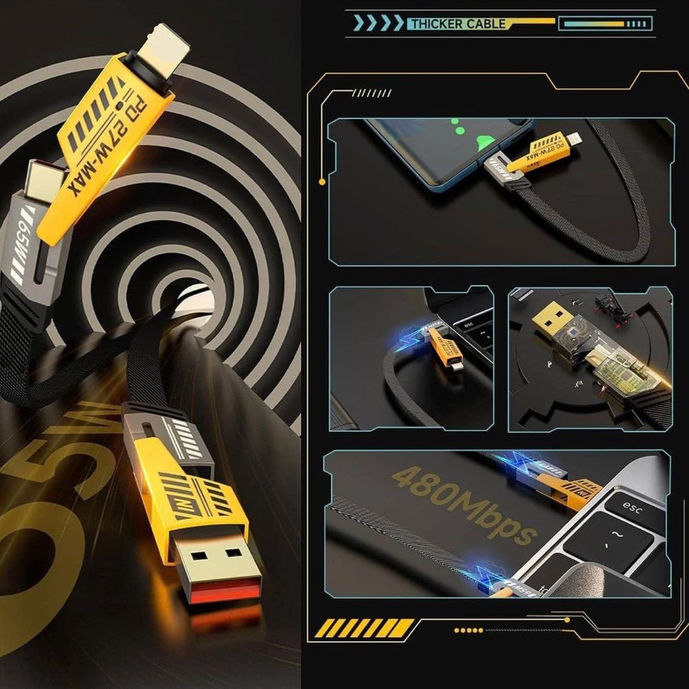 Cáp sạc nhanh đa năng 4in1 27W dây dù là sản phẩm công nghệ cao cấp dành cho người dùng hiện đại, giúp giải quyết triệt để vấn đề "đa thiết bị - một cáp sạc". Với thiết kế độc đáo kết hợp giữa dây dù bền bỉ và các đầu kết nối thông minh, sản phẩm mang đến trải nghiệm sạc pin siêu nhanh, an toàn cho mọi thiết bị công nghệ.