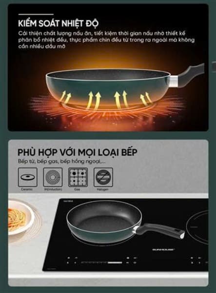 Đáy chảo: Đáy từ đa lớp, tỏa nhiệt đều, tương thích bếp ga, hồng ngoại và từ