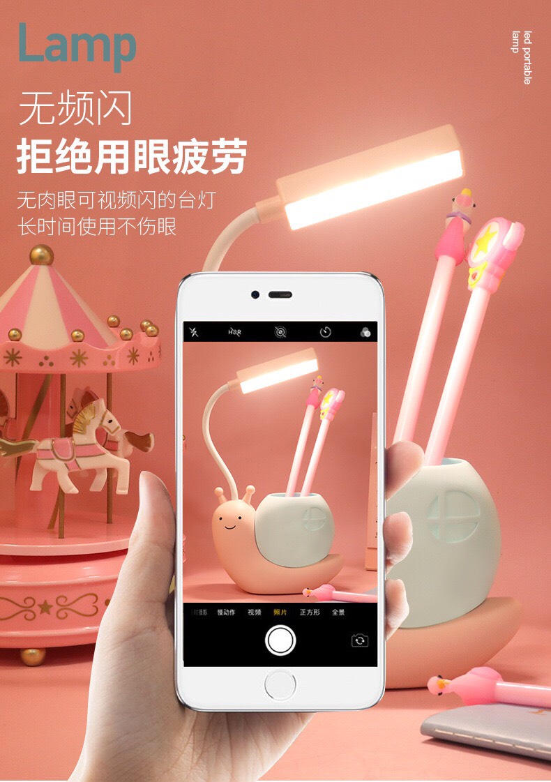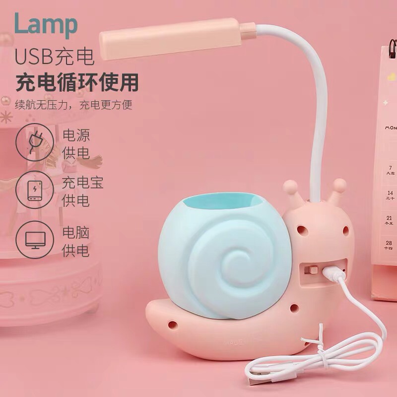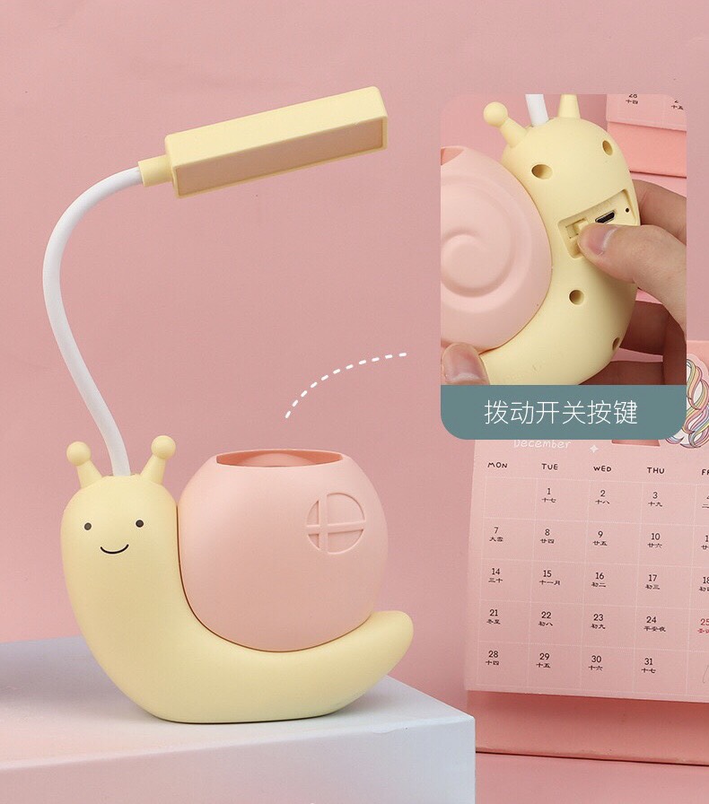 ✔ Bên ngoài là họa tiết ốc sên vô cùng xinh xắn, trên lưng có cốc đựng bút rất tiện lợi