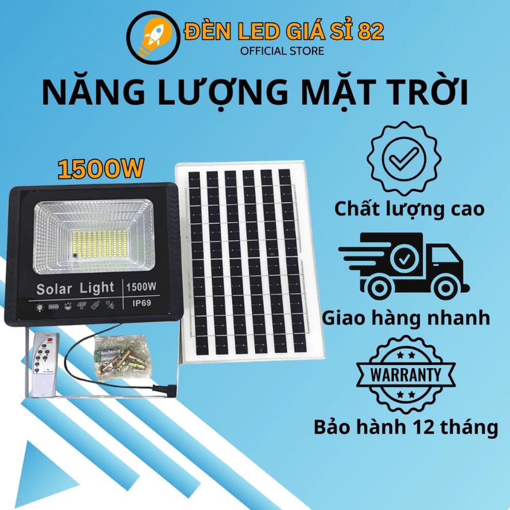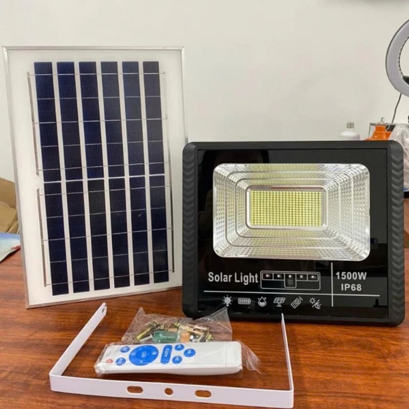Đèn pha năng lượng mặt trời chống nước có remote 1500W là giải pháp chiếu sáng tiện lợi, tiết kiệm điện năng và thân thiện môi trường. Thiết kế chống nước chuẩn IP65, hoạt động bền bỉ ngoài trời, đi kèm remote điều khiển từ xa giúp bật/tắt và điều chỉnh ánh sáng dễ dàng. Công suất 1500W cho ánh sáng mạnh, chiếu sáng rộng, lý tưởng cho sân vườn, công trình, kho bãi hoặc lối đi ngoài trời.