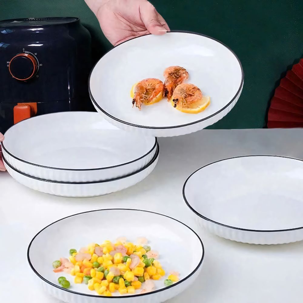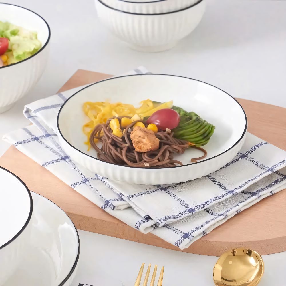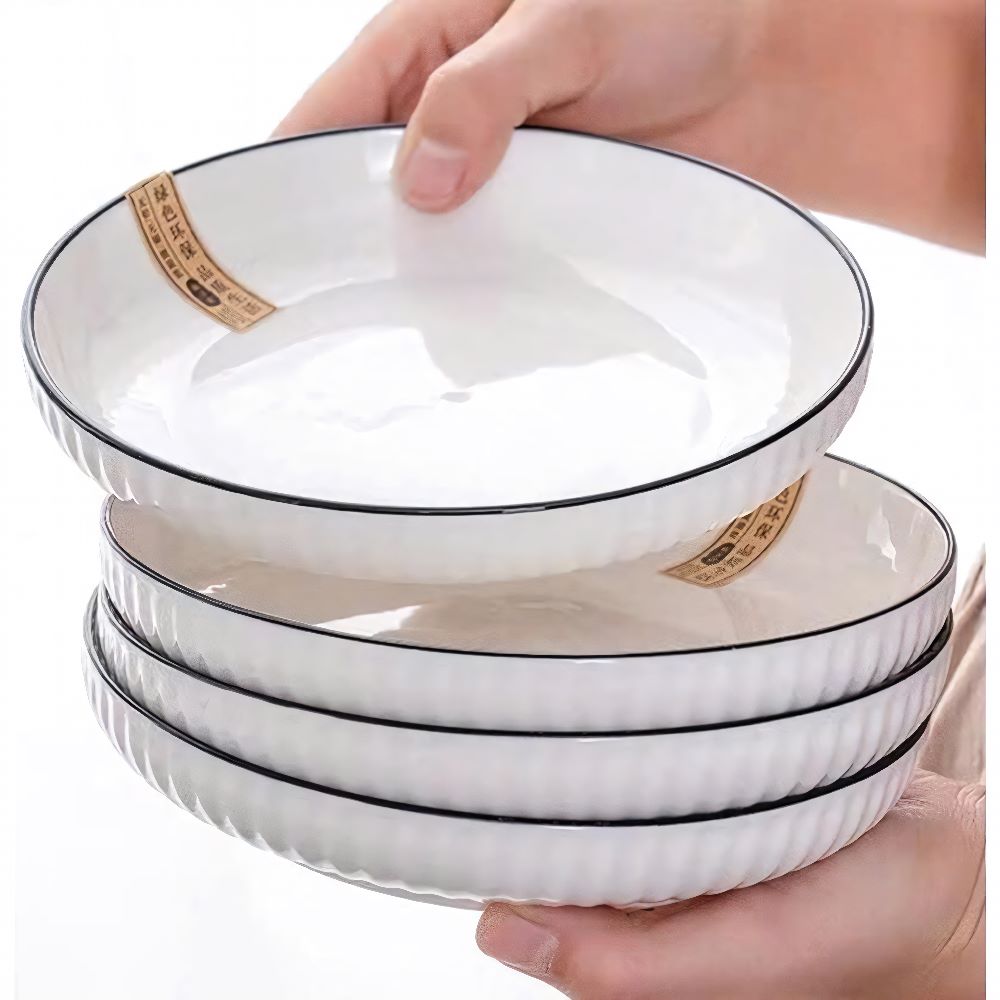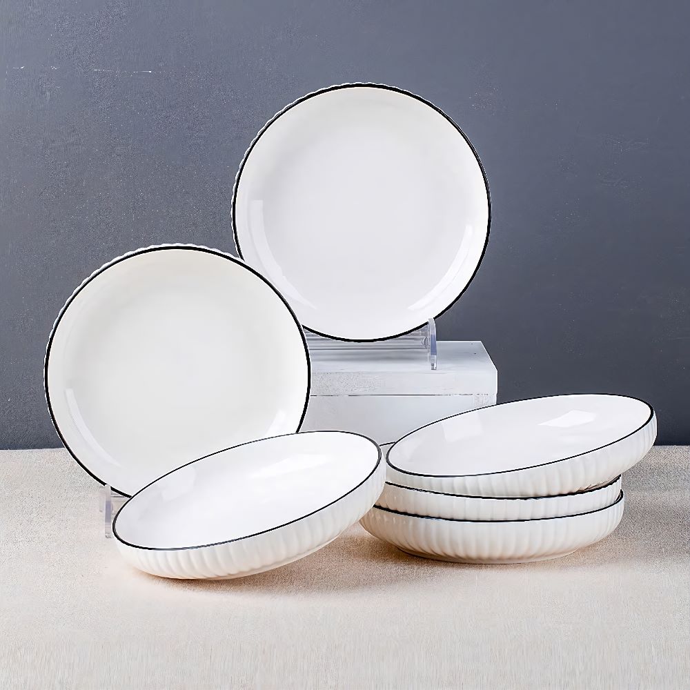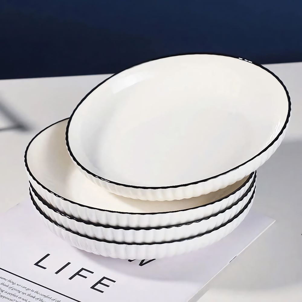 Đĩa sứ vân dọc trắng viền đen số 6 - giải pháp hoàn hảo, nâng tầm trải nghiệm ăn uống và tô điểm không gian bàn ăn của bạn. Liên hệ ngay với kho sỉ gia dụng Linh Kiện Khánh Nhân để được tư vấn và đặt hàng với giá ưu đãi nhất!