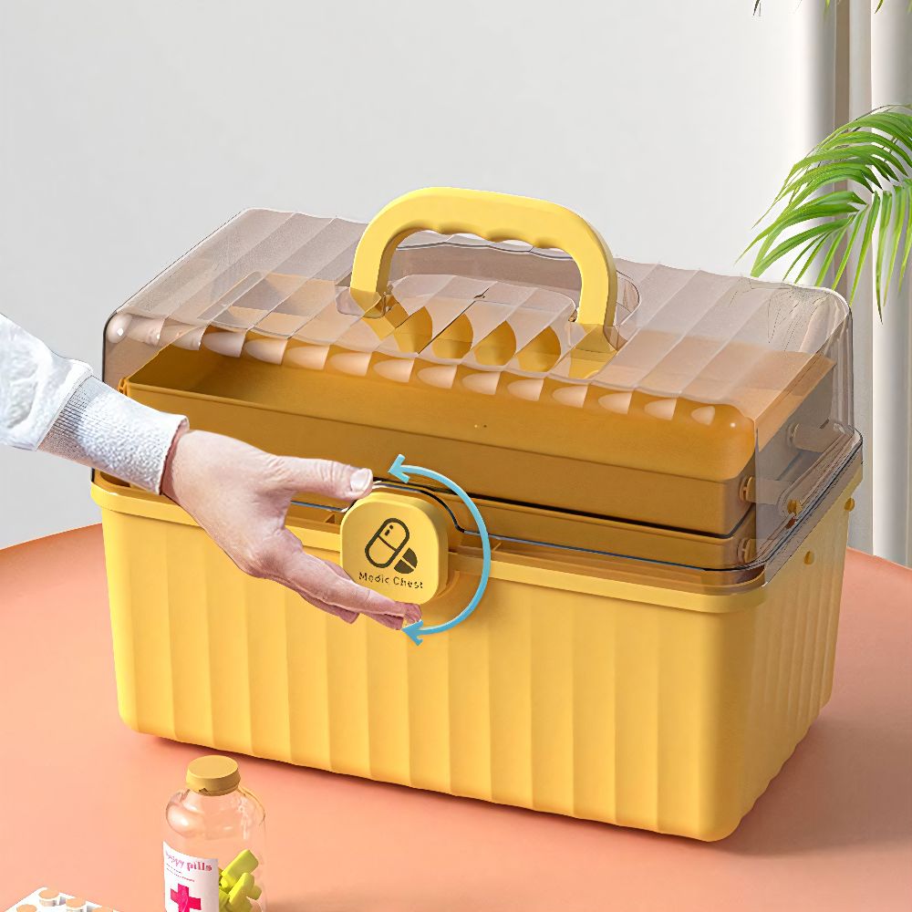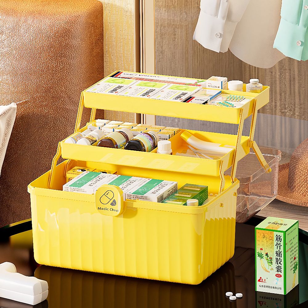 Hộp đựng thuốc đa năng được thiết kế với 3 tầng riêng biệt, giúp bạn dễ dàng phân loại và sắp xếp các loại thuốc theo nhóm, tác dụng hoặc thời gian sử dụng. Tầng trên cùng phù hợp để đựng các chai thuốc nhỏ, ống tiêm hoặc dụng cụ y tế.
