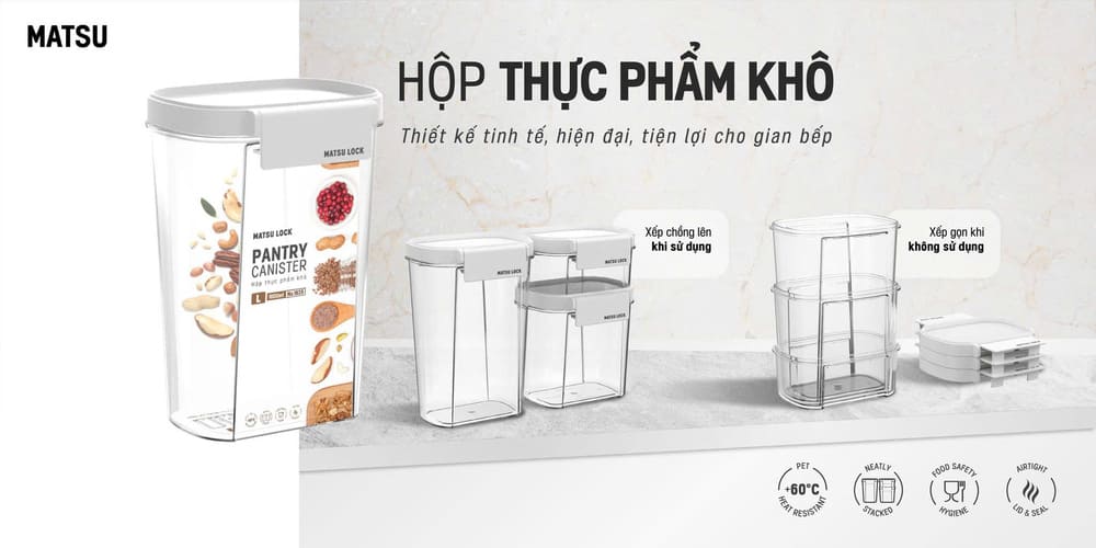 Giúp việc bảo quản thực phẩm khô trong gian bếp trở nên gọn gàng và an toàn hơn với Hộp thực phẩm khô Matsu Lock 1600ml Duy Tân. Thiết kế dung tích vừa phải, chất liệu nhựa cao cấp trong suốt, dễ quan sát lượng thực phẩm bên trong. Nắp hộp kín chắc chắn, chống ẩm và chống côn trùng, giúp hạt ngũ cốc, bánh kẹo, đậu, mì… luôn thơm ngon, bảo toàn dinh dưỡng.