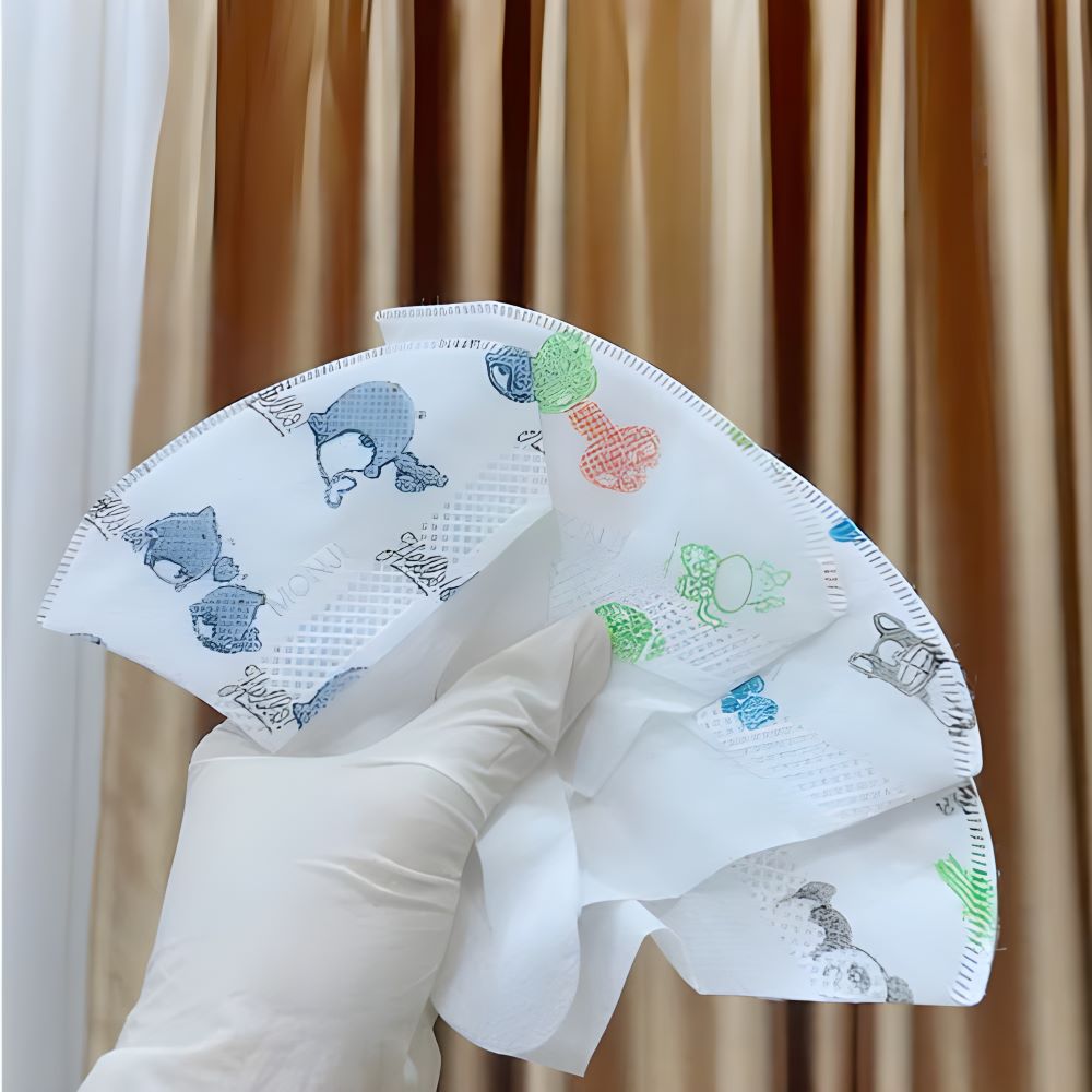 Chất liệu vải không dệt mềm mại, không gây kích ứng làn da nhạy cảm của trẻ, đặc biệt là khi đeo trong thời gian dài. Dây đeo tai co giãn, vừa vặn với kích cỡ đầu của trẻ, không gây đau hay khó chịu.