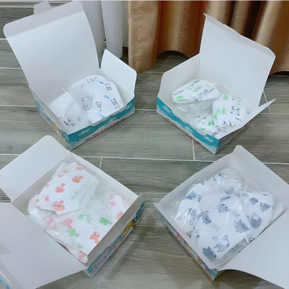 Sản phẩm được đóng gói trong hộp 50 chiếc, mỗi chiếc được đóng gói riêng biệt, đảm bảo vệ sinh và tiện lợi khi sử dụng. Phụ huynh có thể dễ dàng chuẩn bị khẩu trang mới cho con mỗi ngày hoặc mang theo khi đi xa.