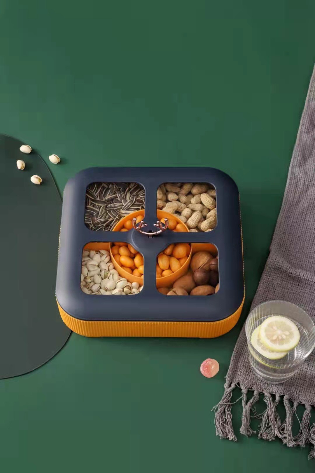 - Khay đựng bánh kẹo gồm 2 tầng 4 hũ cạnh và một hũ giữa tròn/ tầng 1,và có nắp đậy giúp bạn bảo quản mứt bánh luôn được thơm ngon và vệ sinh.