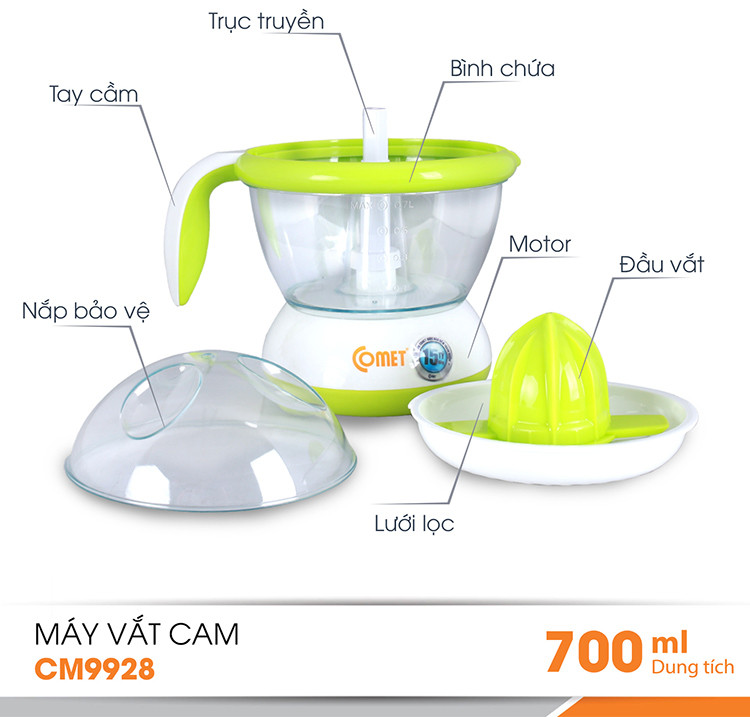 - Máy vắt cam CM9920 với màu trắng xanh đẹp mắt, có thiết kế nhỏ gọn nhưng không kém phần sang trọng, được chế tạo bằng loại nhựa trong suốt cao cấp, giúp bạn dễ dàng quan sát lượng nước trái cây bên trong khi đang vắt hoặc khi sử dụng.
