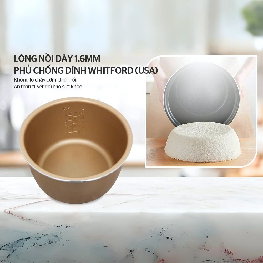 Lòng nồi cơm điện được phủ lớp chống dính cao cấp, hạn chế tình trạng cháy dính cơm và đảm bảo dễ dàng lau rửa. Vỏ ngoài bằng nhựa cao cấp chịu nhiệt tốt, chống bám bẩn và luôn sáng bóng như mới.
