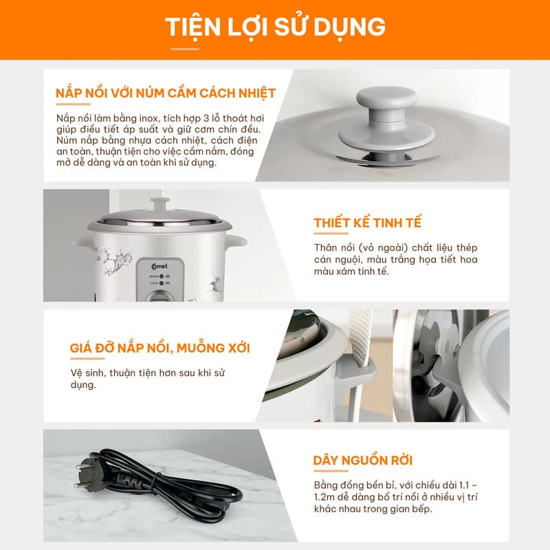 Trải nghiệm bữa cơm dẻo ngon, tiện lợi với Nồi cơm điện nắp rời Comet CMB8020 dung tích 1.8L. Thiết kế nắp rời dễ dàng mở và vệ sinh, lòng nồi chống dính cao cấp giúp cơm chín đều, không bị bám. Dung tích 1.8L thích hợp cho gia đình 3–5 người, vừa nấu cơm, vừa hấp hay nấu cháo. Nồi có công suất mạnh, nấu nhanh và giữ nhiệt tốt, mang đến bữa ăn nóng hổi và thơm ngon.