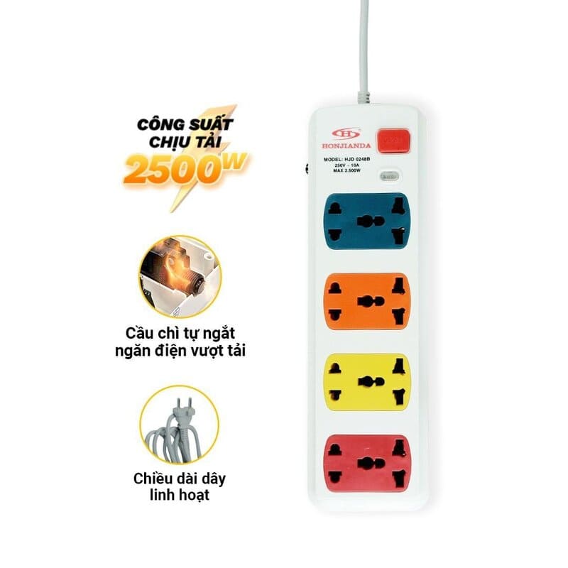 Tên sản phẩm: Ổ cắm điện có cầu chì tự động 6 lỗ + 2 USB dây 3m HJD 0248B-2U
