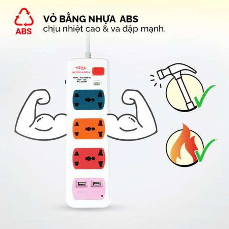 Ổ cắm điện HJD 0248B-2U tích hợp 6 lỗ cắm cùng 2 cổng USB kèm dây dài 3m, bảo vệ thiết bị bằng cầu chì tự động khi quá tải. Thiết kế tiện lợi, an toàn, giúp kết nối nhiều thiết bị điện và sạc USB đồng thời, phù hợp dùng trong gia đình, văn phòng hoặc phòng học. ⚡✨