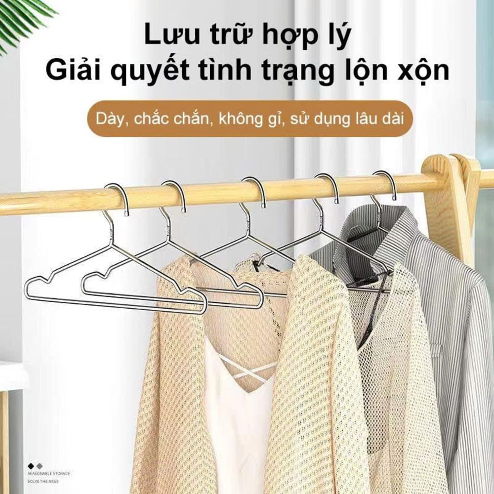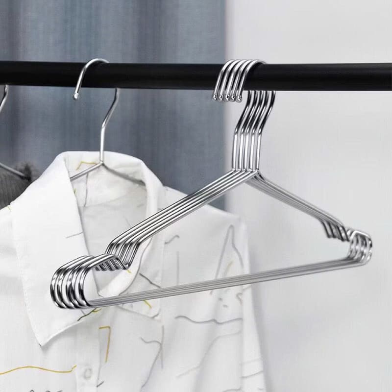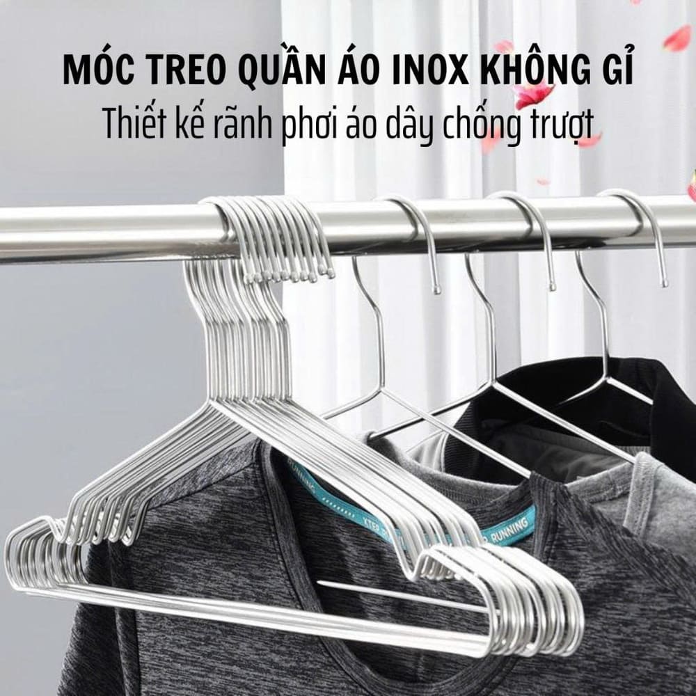 Set 10 móc treo quần áo inox giúp treo đồ gọn gàng, chắc chắn, không lo gỉ sét khi sử dụng lâu dài. Thiết kế đơn giản, bền đẹp, phù hợp treo nhiều loại quần áo từ áo sơ mi, áo khoác đến quần dài, giúp tủ đồ luôn ngăn nắp và sạch sẽ.
