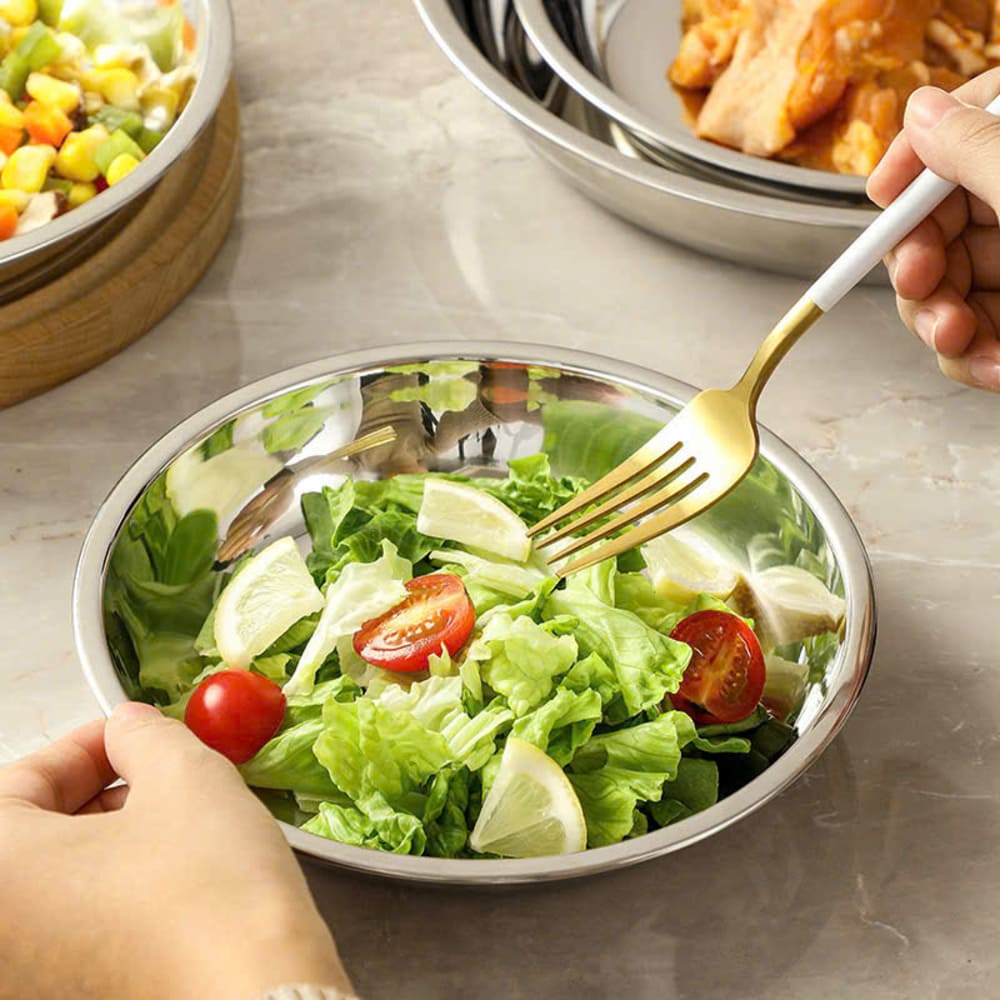 Set 3 đĩa sâu inox đựng thực phẩm là lựa chọn tiện lợi cho căn bếp gọn gàng, sạch đẹp. Với 3 kích thước 20–22–24cm, bộ đĩa giúp bạn dễ dàng đựng, bảo quản và bày biện nhiều loại thực phẩm khác nhau – từ rau củ, thịt cá đến món ăn đã nấu chín. 🍽️✨