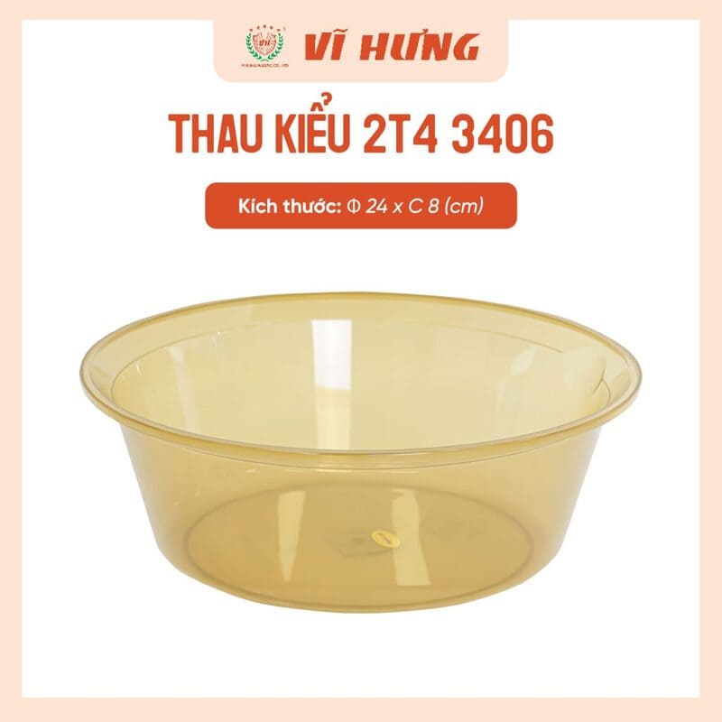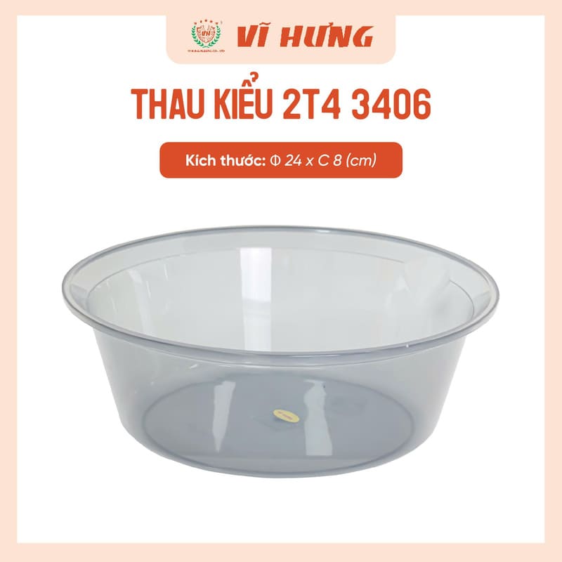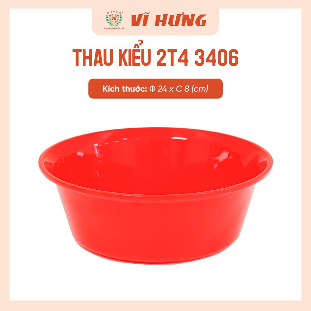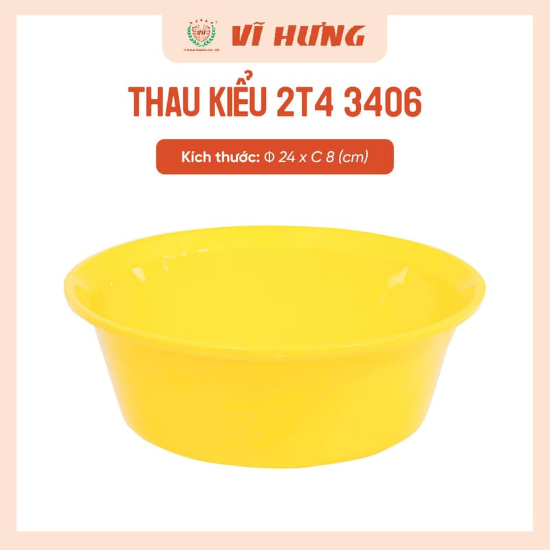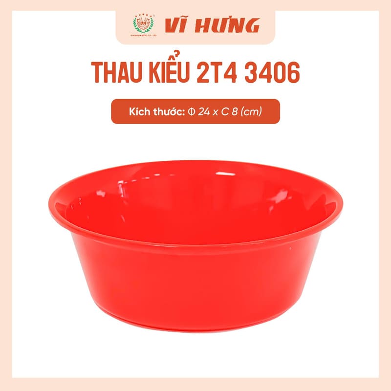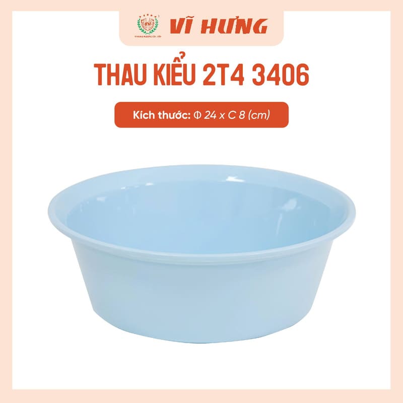 Thau nhựa tròn kiểu Vĩ Hưng 2T4 3406 được sản xuất từ nhựa PP cao cấp, thiết kế dạng tròn truyền thống, lòng vừa phải và thành thau chắc chắn, phù hợp sử dụng trong sinh hoạt hằng ngày như rửa thực phẩm, giặt đồ hoặc đựng nước.