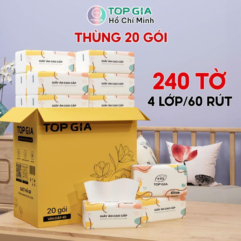 Chất lượng cao cấp với cấu trúc 4 lớp: Giấy ăn Topgia được thiết kế với 4 lớp dày dặn, mang lại độ mềm mại vượt trội cùng khả năng thấm hút mạnh mẽ. Cấu trúc đa lớp giúp sản phẩm không chỉ mềm mại mà còn đảm bảo độ bền khi sử dụng, không dễ rách hay vụn vỡ.