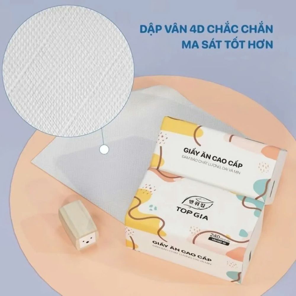 Độ dày và khả năng thấm hút tốt hơn: Cấu trúc 4 lớp của giấy ăn Topgia vượt trội so với các sản phẩm 2-3 lớp thông thường, mang lại hiệu quả sử dụng cao hơn và cảm giác thoải mái hơn khi sử dụng.
