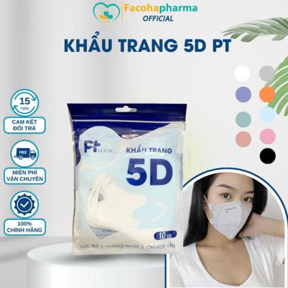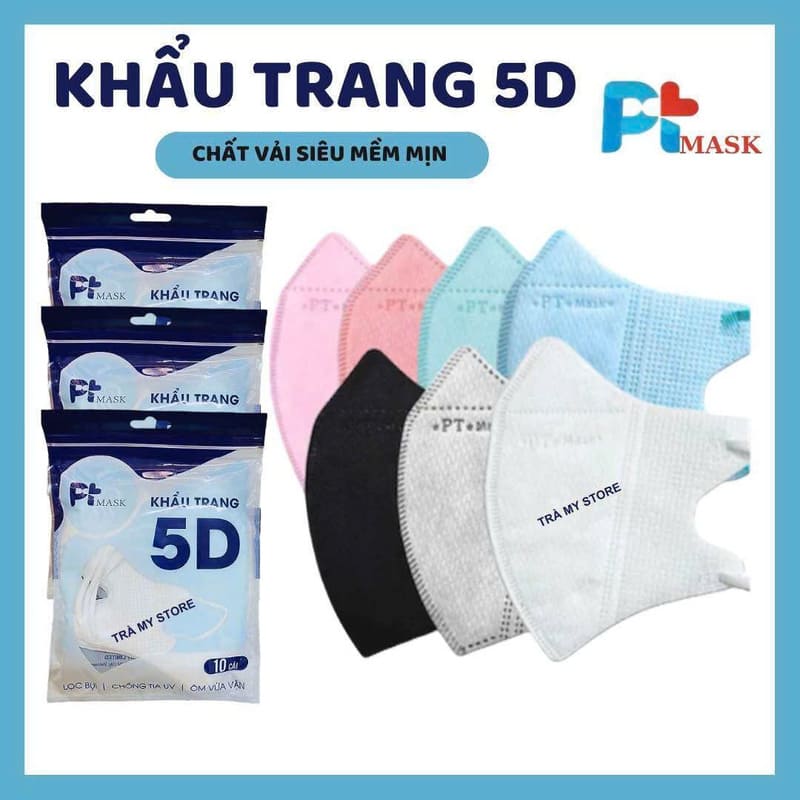 Khẩu trang y tế 5D PTMask thiết kế ôm sát khuôn mặt, tạo không gian thở thoải mái và tăng hiệu quả bảo vệ. Sản phẩm đóng túi 10 cái tiện lợi, phù hợp mang theo khi đi học, đi làm hoặc di chuyển hằng ngày.